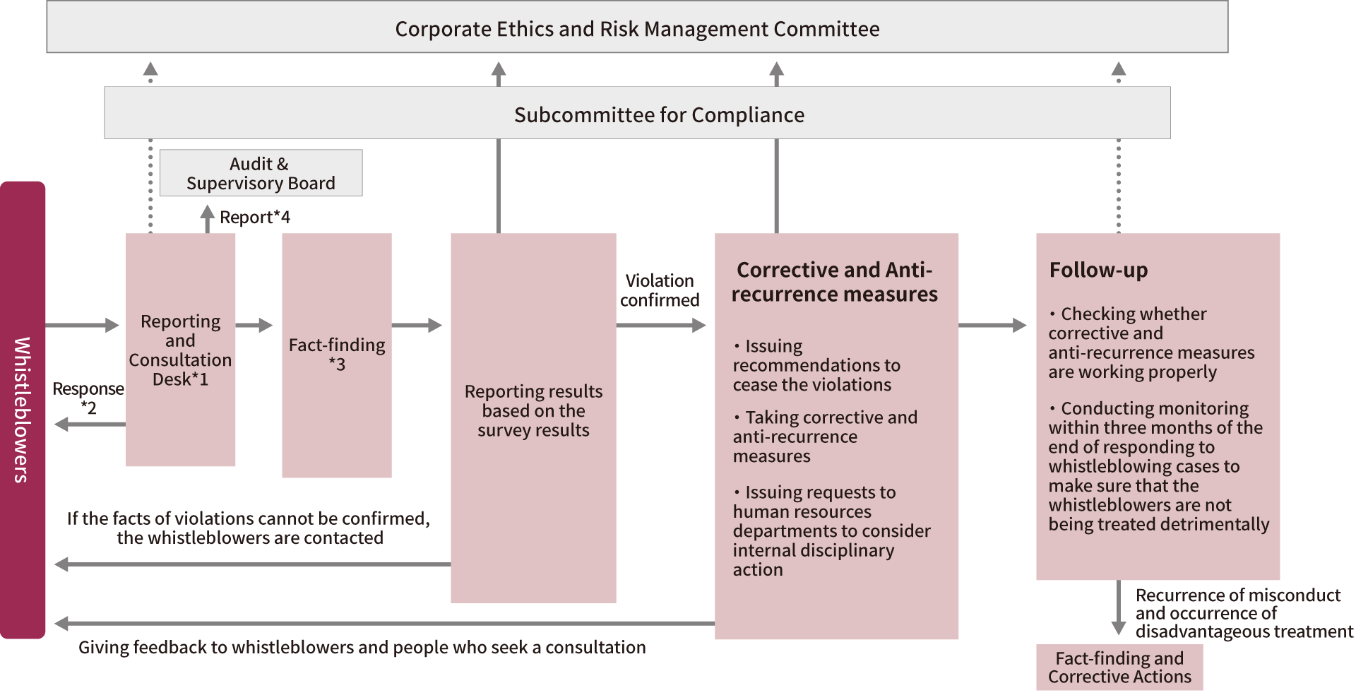 - *3After a whistleblowing report has been received, if the details need to be investigated, the whistleblower will be informed that an investigation into the facts will be commenced, then an investigation will be conducted. The utmost care will be taken to ensure that the privacy and human rights of the whistleblower will not be violated. Due consideration will also be given to the privacy of the people being reported.