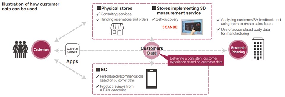 To transform itself into a company that can secure high profitability even in an increasingly severe external environment, Wacoal Corp. is conducting cost restructuring and also strengthening its brand power, customer loyalty, and human resources, with the aim of returning to growth. Furthermore, in order to become a new Wacoal that can respond rapidly to changes in customers and the market, we will pursue reforms such as demand-linked supply chain management so as to reconstruct the value chain into a customer-focused one that leverages digital technology. In the customer strategy we are pursuing as part of our growth strategy, we are making thorough use of digital technology to build deep, broad, and long-term relationships with our customers, and are providing each individual with the customer experience that is the best possible one for them.