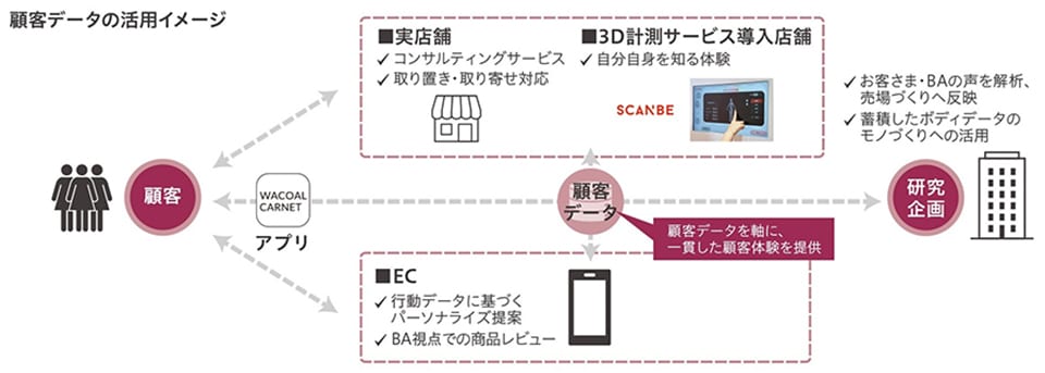 DXビジョンを「未来の当たり前をつくること」と位置づけ、お客さま一人ひとりの未来の日常において”当たり前”となること/ものを思い描くことで、顧客体験の新たな価値を創造することを目指しています。こころとからだは一人ひとり全く異なるものであり、その多様性に寄り添った新たな顧客体験の提供を検討する際には「パーソナライズ」の概念がキーワードになります。従来は個別のお客さま対応には多くのリソースが必要であり物理的な限界が存在していましたが、デジタル技術の活用をもってその壁を越えることが可能になると考えております。当社には、これまでの長年にわたる人間科学研究開発センターでのこころとからだの研究データに加え、「SCANBE(スキャンビー)」によって得られたボディデータ、店舗やECサイトに寄せられたお客さまの声や購買情報、販売員の接客知見など、多くの情報資産が蓄積されています。これらのデータを最大限に活用し、ワコールの「美・快適・健康」分野への事業拡大やよりパーソナライズされた商品・サービスの提供を通じて、お客さまと深く・広く・長い関係性の構築を目指してまいります。