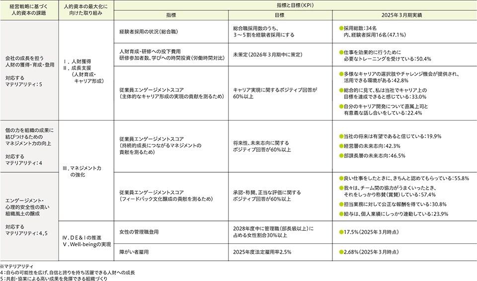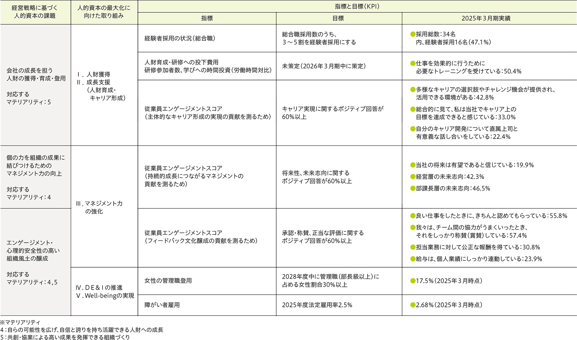 | 基本方針 | 「企業価値向上に向けた人財育成、組織開発」を行い、「会社の成長」と「人的資本への投資・人財の 成長」の好循環を実現する。とりわけ今中期経営計画(リバイズ)においては、個の成長に加え、個の 力を組織の成果に結びつけるための取り組みにより注力し、好循環への道筋をつける。 |